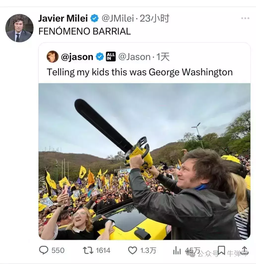 什么根由? 乔治·华盛顿是好意思国的建国总统,那东谈主对小孩说,米莱即是咱们阿根廷的华盛顿。 再莫得比这更高的评价了吧! 米莱大喜,转发了一遍又一遍。