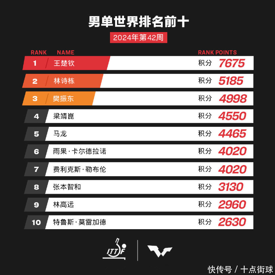 北京时辰10月15日,在阿斯塔纳亚锦赛胁制之后,国外乒联更新了2024年第42周的最新天下排名,由于樊振东自巴黎奥运会之后接连缺席了WTT几项垂危赛事bet365登不上,以及林诗栋在近2个月内的出色说明,19岁的林诗栋再次高潮一个排名,凯旋取代樊振东位列天下第二位,仅次于王楚钦,同期林诗栋也刷新了个东说念主的奇迹生存天下排名新高,另外男单之后的排名按序为第三名樊振东、第四名梁靖崑、第五名马龙,而日本男单“一哥”张本智和凭借在阿斯塔纳亚锦赛上夺得男单冠军,从而卓绝林高远位列天下第8位,除此以外,女片面的天下排名变化不大,孙颖莎、王曼昱、陈梦和王艺迪依然占据着前四的位置,独一排名高潮很是快的,即是刚刚夺得阿斯塔纳亚锦赛女单冠军的朝鲜选手金琴英,她整个飙升了452个排名,如今位列天下第57位,相同刷新了个东说念主奇迹生存新高